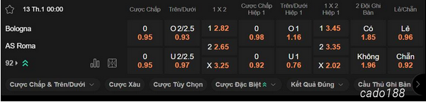 Theo trang chủ 188BET thì hiện tại 2 CLB đang được đánh giá ngang tài ngang sức với mức cược đồng banh. Bologna đang có lịch sử đối đầu áp đảo khi thắng 4, hòa 2 và chỉ thua 1/7 lần gặp AS Roma gần nhất. Các chuyên gia soi kèo cho rằng họ có cửa thắng cao hơn khi được chơi trên sân nhà. ¾ lần tiếp khách mới nhất, Bologna đã thắng cả chuyên môn lẫn cá cược. Trong khi đó AS Roma có phong độ không tốt trên sân khách khi thua 6, hòa 1 và chỉ thắng 2/9 kèo xa nhà vừa qua.