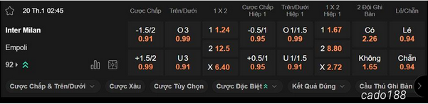 Với đẳng cấp vượt trội và lợi thế sân bãi, Inter Milan được 188BET đánh giá rất cao qua kèo chấp – 1.5/2. Thống kê từ các chuyên gia soi kèo cho thấy họ đã thắng 8, hòa 1 và chỉ thua 1 trận trong 10 lần gặp Empoli gần nhất. Phong độ của Inter Milan cũng khá tốt khi họ thắng 5 trong số 8 kèo TLCA vừa qua. Empoli lại tương đối bất ổn khi thua 5 và thắng 4/9 kèo đấu mới đây. Giới chuyên môn hiện tại vẫn nghiêng về kịch bản chiến thắng cho đội chủ nhà khi các vị khách mất quá nhiều trụ cột trước thềm trận đấu này.
