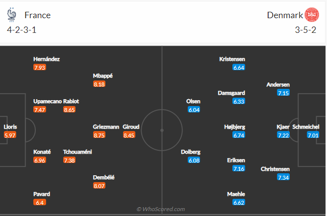 Phong độ của Pháp của World Cup là không thể coi thường khi họ toàn thắng ở cả 5 trận gần nhất. Đối đầu với một Đan Mạch bị đánh giá yếu hơn rất nhiều thì đây sẽ là chiến thắng dành cho đội tuyển Pháp.