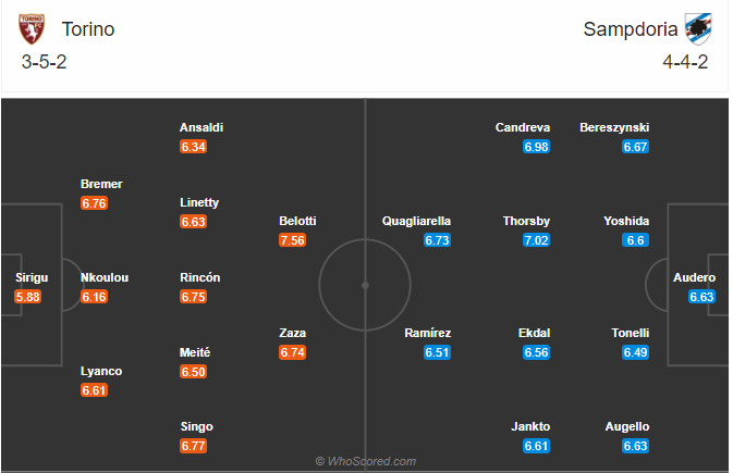 Torino đang đứng thứ 18 trên bảng xếp hạng, vị trí sẽ phải xuống hạng vào cuối mùa, đây rõ ràng không phải vị trí khiến đội bóng này hài lòng và điều họ cần làm vào lúc này là một chiến thắng để cải thiện thứ hạng hiện có. Tiếp Sampdoria trên sân nhà là cơ hội tốt để đội bóng của HLV Marco Giampaolo giành 3 điểm bởi đối thủ đang không có phong độ tốt, nhiều khả năng Torino sẽ có một trận đấu tốt và đạt được mục tiêu đề ra.