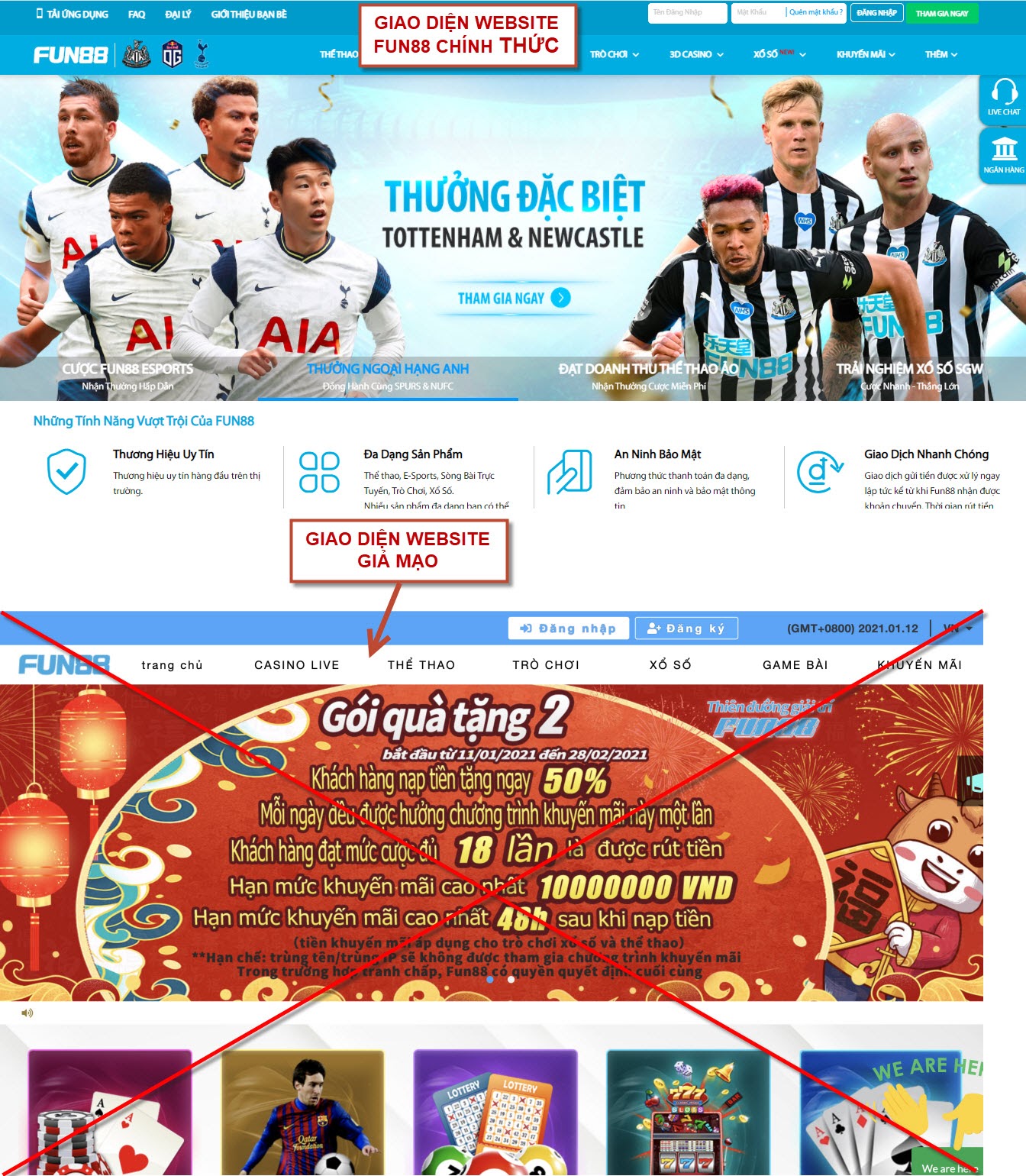 Hình ảnh đối chiếu website giả mạo WEBSITE FUN88 CHÍNH THỨC