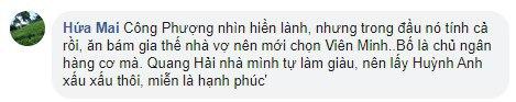 Tài khoản Hứa Mai:” Công Phượng nhìn hiền lành, nhưng trong đầu nó tính cả rồi, ăn bám gia thế nhà vợ nên mới chọn Viên Minh..Bố là chủ ngân hàng cơ mà. Quang Hải nhà mình tự làm giàu, nên lấy Huỳnh Anh xấu xấu thôi, miễn là hạnh phúc’.