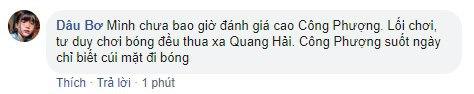 Tài khoản Dâu Bơ:” Mình chưa bao giờ đánh giá cao Công Phượng. Lối chơi, tư duy chơi bóng đều thua xa Quang Hải. Công Phượng suốt ngày chỉ biết cúi mặt đi bóng.’/