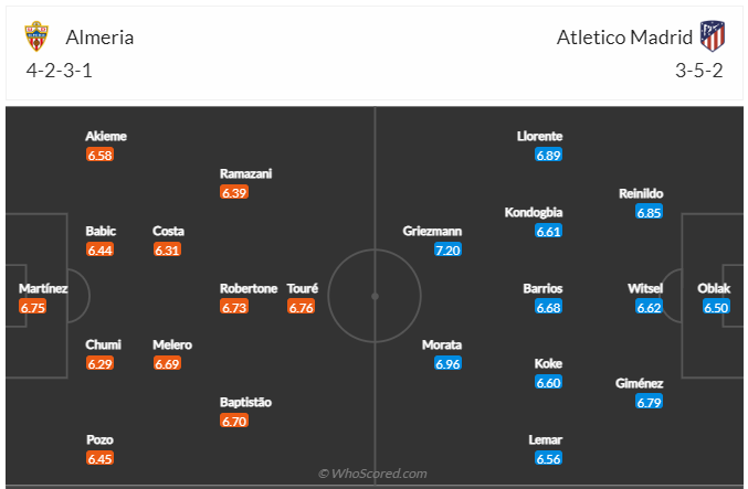 Atletico Madrid đang chơi thật sự không tốt mùa này, họ đang đứng thứ 5 trên bảng xếp hạng với phong độ không tốt thời gian vừa qua. Việc chỉ thắng được 2/6 vòng gần đây rõ ràng là điều khiến HLV Diego Simeone phải đau đầu nghĩ cách cải thiện phong độ. Hơn lúc nào hết các cầu thủ Atletico Madrid cần chiến thắng vào lúc này để có thể nhanh chóng lọt vào top 4 đội mạnh nhất. Đến làm khách trên sân của đội bóng mới lên hạng Almeria không phải trận đấu quá khó khăn và nhiều khả năng Atletico Madrid sẽ giành chiến thắng trận đấu này.