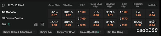 Mức kèo Tài Xỉu mà nhà cái 188BET dành cho màn đọ sức tại sắp tới của 2 đội là 3/3.5 bàn. Monaco đang thi đấu khá cởi mở với 4/5 trận vừa qua nổ Tài. Còn các trận có Crvena Zvezda liên tiếp cán mốc Tài ở cả giải quốc nội lẫn quốc tế. Đây là trận đấu rất quan trọng đối với mục tiêu của hai đội tuyển tại chiến dịch Champions League năm nay. Do đó, chuyên gia kèo đá banh 188bet đánh giá nhiều khả năng cao đội sẽ chủ động giữ nhịp độ ở mức trung bình và đề cao tính chiến thuật. Một màn rượt đuổi tỷ số là kịch bản rất dễ xảy ra giúp nhà đầu tư tối ưu hóa lợi nhuận.