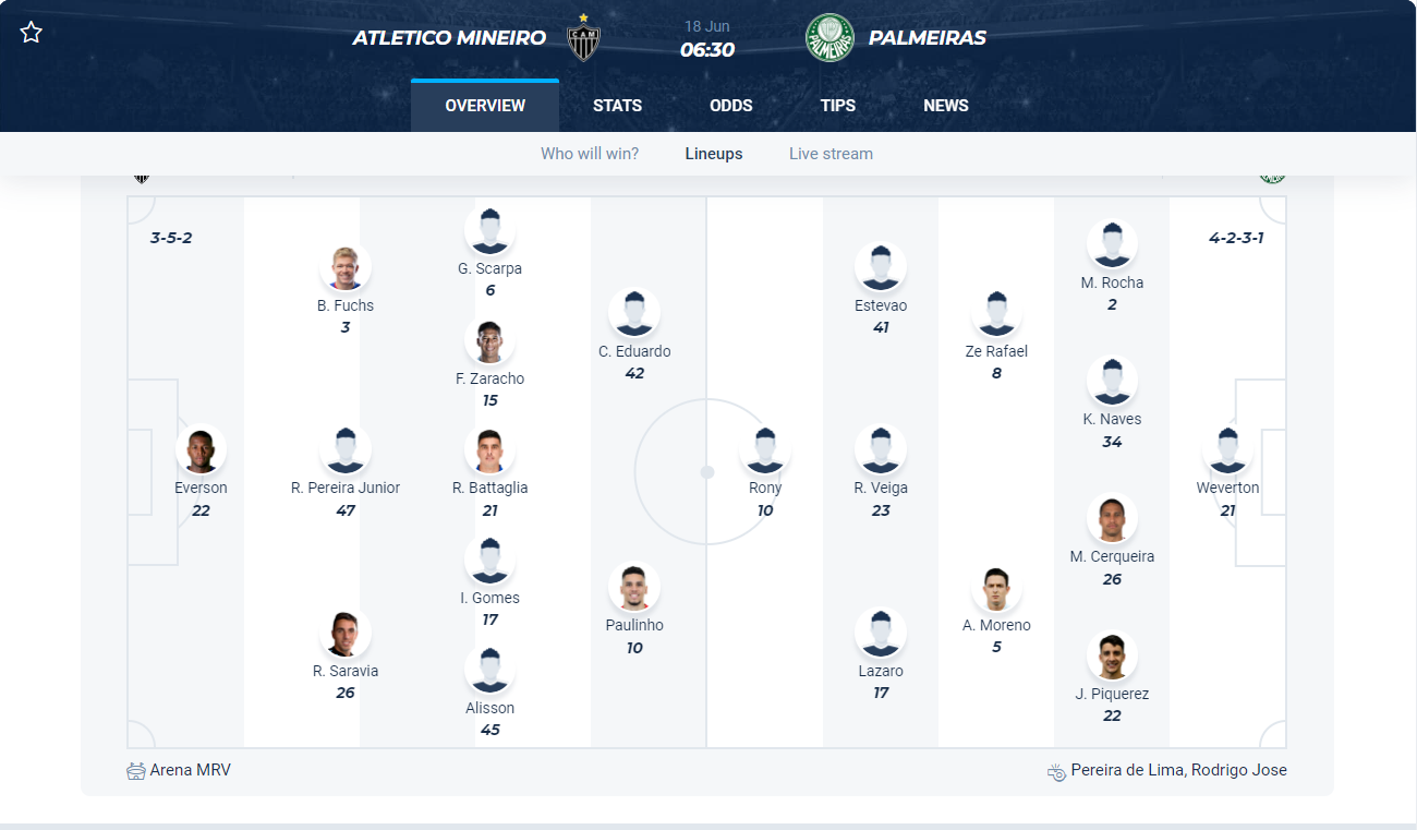 Palmeiras là đội bóng mạnh và giàu truyền thống của Brazil, họ từng nhiều lần vô địch quốc gia và đang là đương kim vô địch giải đấu. Thành tích mùa trước như vậy nên việc đang đứng thứ 6 trên bảng xếp hạng ở thời điểm hiện tại là thành tích không hề tốt của đội bóng này. Họ cần chơi tốt và ổn định hơn để cạnh tranh cho vị trí dẫn đầu, chính vì vậy 3 điểm là điều duy nhất các cầu thủ Palmeiras hướng đến khi đến làm khách trên sân của Atletico Mineiro. Dù đội chủ nhà không yếu thì khả năng Palmeiras sẽ biết cách tận dụng cơ hội để ra về với 3 điểm trọn vẹn.