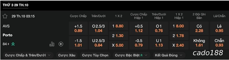 AVS mặc dù là đội bóng bị đánh giá thấp hơn khá nhiều, nhưng Porto cũng cần phải có những sự dè chừng nhất định. Theo đó, AVS vẫn chưa để thua trên sân nhà của mình tại 4 trận đấu ở mùa giải này với thành tích 2 chiến thắng và 2 trận hòa. Song, nhìn chung thì Porto với một đội hình gồm nhất cầu thủ đẳng cấp và bề dày kinh nghiệm sẽ đủ sức để giành trọn 3 điểm, nhưng chắc chắn không phải là một chiến thắng dễ dàng. Dẫu vậy, người chơi có thể tự tin tham khảo tỷ lệ chấp -1.5 bàn đến từ nhà cái 188BET khi Porto đang được giới chuyên gia nhận định sẽ sở hữu tỷ lệ chiến thắng vượt trội.