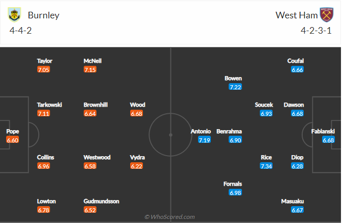 Burnley đang đứng thứ 18 trên bảng xếp hạng, họ đang kém vị trí an toàn 3 điểm. 4 vòng gần nhất đội bóng của HLV Sean Dyche không thể giành chiến thắng với 3 hòa và 1 thua nên đội bóng này cần có 3 điểm để chấm dứt mạch trận kém cỏi vừa qua. Chính vì vậy khi tiếp West Ham trên sân nhà, 3 điểm là điều mà các cầu thủ Burnley muốn hương đến. Tuy nhiên đội khách đang chơi tốt mùa này và đang rất tự tin nên nhiều khả năng chủ nhà Burnley sẽ không thể đạt được mục tiêu.