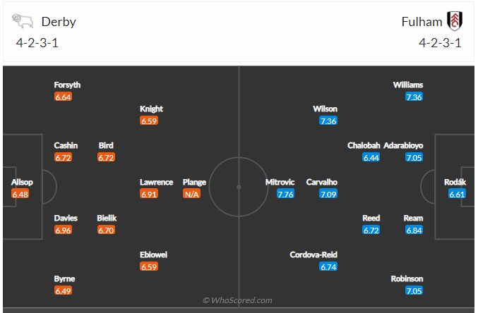 Fulham đang chơi tốt tại mùa giải năm nay khi vững vàng ở đầu bảng xếp hạng với 14 điểm nhiều hơn đội đứng thứ 3. Thêm một chiến thắng nữa thì đội bóng của HLV Marco Silva sẽ chính thức trở lại Premier League. Chính vì vậy các cầu thủ Fulham sẽ càng chơi quyết tâm hơn ở vòng đấu thứ 42 này để có thể đạt được mục đích. Đến làm khách trên sân của Derby Couny không phải thử thách quá khó khăn đối với Fulham và nhiều khả năng đội bóng đầu bảng sẽ tiếp tục có được chiến thắng.