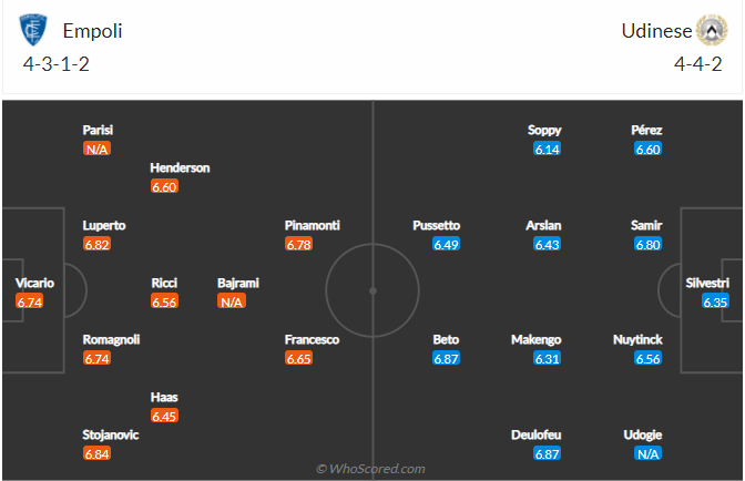 Udinese là đội bóng trung bình yếu của Serie A, mùa bóng trước đội bóng này cán đích ở vị trí thứ 14. Mùa bóng này thầy trò HLV Luca Gotti muốn làm tốt hơn thế nhưng thực tế diễn ra cho thấy họ chưa có gì tiến bộ, việc đứng thứ 14 như hiện tại không phải tệ nhưng chắc chắn chưa thể khiến đội bóng này hài lòng. 3 vòng đấu gần nhất Udinese không thể giành chiến thắng nên họ muốn có 3 điểm khi đến làm khách trên sân của Empoli. Tuy nhiên trước đối thủ đang chơi tương đối tốt trên sân nhà thì cơ hội có điểm của Udinese là không cao.