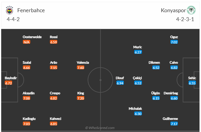 Fenerbahce đang đứng thứ 2 trên bảng xếp hạng, họ đang kém đội đầu bảng 6 điểm. Cơ hội giành chức vô địch là vẫn còn dù mọi việc rất khó khăn và điều đội bóng của HLV Jorge Jesus cần làm vào lúc này đơn giản là giành chiến thắng để tiếp tục bám đuổi. Sau khi chỉ có được trận hòa ở vòng đấu trước các cầu thủ Fenerbahce cần ngay lập tức trở lại với mạch chiến thắng, đối thủ Konyaspor không phải đội bóng mạnh nên cơ hội giành 3 điểm với đội chủ nhà rất cao. Nhiều khả năng Fenerbahce sẽ có 3 điểm trận này.