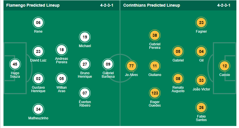 Flamengo có thành tích rất tốt những mùa bóng gần đây, họ đang là đương kim vô địch của giải đấu nên mùa giải này mục tiêu của họ là bảo vệ ngôi vương. Tuy nhiên hiện tại xem ra mục tiêu đó khó thành hiện thực khi họ đang kém đội đầu bảng 8 điểm trong khi mùa giải không còn dài. Chính vì vậy điều mà đội bóng của HLV Renato Gaúcho cần làm vào lúc này là giành chiến thắng trong các trận còn lại. Chính vì vậy khi tiếp Corinthians trên sân nhà, chiến thắng là điều duy nhất các cầu thủ Flamengo hướng đến. Với phong độ như hiện tại thì khả năng họ sẽ có được điều mình cần.