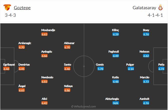 Galatasaray mùa trước dù không thể bảo vệ ngôi vương nhưng cán đích ở vị trí thứ 2 không quá tệ với đội bóng này. Tuy nhiên mùa bóng năm nay đang thực sự là thảm họa khi đội bóng của HLV Domènec Torrent đang đứng thứ 14 trên bảng xếp hạng cùng chuỗi 6 trận không thắng. Nếu không cải thiện phong độ thì từ ứng cử viên vô địch Galatasaray sẽ phải nghĩ đến việc đấu tranh cho suất trụ hạng. Chính vì vậy nên họ cần thắng khi đến làm khách trên sân của Goztepe. Trong bối cảnh đội chủ nhà cũng rất cần điểm thì phong độ không tốt của Galatasaray khả năng sẽ chỉ giúp họ có được 1 điểm.
