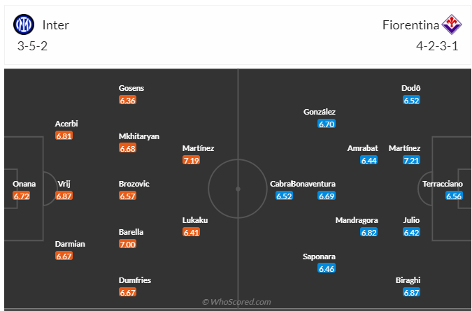 Fiorentina đang chơi với phong độ rất cao thời gian gần đây, họ toàn thắng 4 trận gần nhất để leo lên vị trí thứ 9 trên bảng xếp hạng. Nếu tiếp tục giữ phong độ như hiện tại thì đội bóng của HLV Vincenzo Italiano sẽ còn có vị trí cao hơn nữa. Họ hướng đến một chiến thắng nữa khi đến làm khách trên sân của Inter ở vòng đấu thứ 28 này, tuy nhiên trước đối thủ có chất lượng đội hình tốt hơn thì nhiều khả năng Fiorentina sẽ chỉ có được kết quả hòa, đây cũng không phải tỉ số tệ đối với đội bóng này.