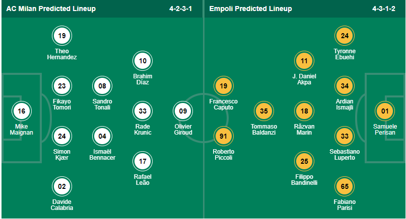 Milan đã chấm dứt chuỗi trận tệ hại của mình bằng chiến thắng hoành tráng 4-0 trước đội đầu bảng Napoli ngay trên sân đối phương, chiến thắng không chỉ giúp các học trò của HLV Stefan Pioli vẫn đứng trong top 4 mà còn khiến tinh thần của họ tự tin hơn. Tuy nhiên khoảng cách với đội đứng thứ 5 chỉ là 1 điểm nên nếu không cẩn thận thì Milan có thể rơi ra khỏi top dự Champions League bất cứ lúc nào, chính vì vậy nên khi tiếp Empoli thì Milan cần tiếp tục giành chiến thắng để giữ vị trí của mình. Trước đội khách đang không chơi tốt thì nhiều khả năng Milan sẽ có 3 điểm trận này.