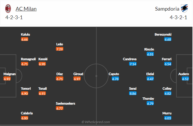 Milan đang đứng thứ 3 trên bảng xếp hạng, họ đã tụt 1 bậc sau khi không thắng 2 vòng liên tiếp. Tuy nhiên chiến thắng quan trọng trước đội bóng cùng thành phố Inter đã giúp thầy trò HLV Stefan Pioli tự tin hơn rất nhiều và cho thấy thực lực của họ không hề kém. Với việc chỉ kém đội đầu bảng 1 điểm thì một chiến thắng trước Sampdoria có thể sẽ giúp Milan leo lên ngôi đầu bảng, nhiều khả năng chất lượng đội hình tốt hơn sẽ giúp Milan có chiến thắng ở vòng đấu này.