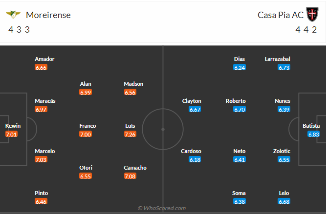 Với lợi thế sân nhà, Moreirense sẽ đẩy cao đội hình ngay từ những phút thi đấu đầu tiên và liên tục uy hiếp khung thành của Casa Pia để sớm tìm được bàn thắng dẫn trước. Nếu chắt chiu cơ hội có được, Moreirense hoàn toàn có thể khép lại hiệp 1 với lợi thế dẫn trước 1 bàn.