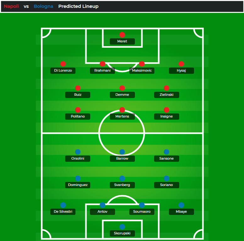 Napoli đang đứng thứ 6 với 44 điểm, họ đang kém vị trí top bốn 5 điểm nhưng đá ít hơn 1 trận, cơ hội giành vé dự Champions League với đội bóng của HLV Gennaro Gattuso vẫn còn rất cao và điều họ cần làm là chơi tốt các trận đấu của mình để bám đuổi các đội xếp trên. Ở vòng 26 này đối thủ của Napoli là Bologna, đội bóng trung bình của Serie A, mục tiêu chiến thắng trận này nằm trong tầm tay của đội bóng chủ nhà và nhiều khả năng họ sẽ chơi đủ tốt để giành 3 điểm.