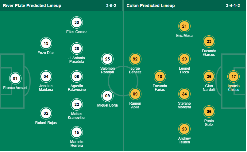 River Plate đang chơi tốt mùa này khi đang đứng đầu bảng xếp hạng, họ đang hơn đội đứng thứ 2 những 8 điểm dù đá nhiều hơn 1 trận. Đây là khoảng cách an toàn tuy nhiên đội bóng của HLV Martín Demichelis vừa để thua vòng đấu gần nhất nên họ không được phép tiếp tục để các đội phía sau rút ngắn khoảng cách về điểm số nữa. Chính vì vậy khi tiếp Colon trên sân nhà thì chiến thắng là điều duy nhất mà các cầu thủ River Plate hướng đến, trước đối thủ yếu hơn nhiều thì khả năng họ sẽ có được 3 điểm trọn vẹn.