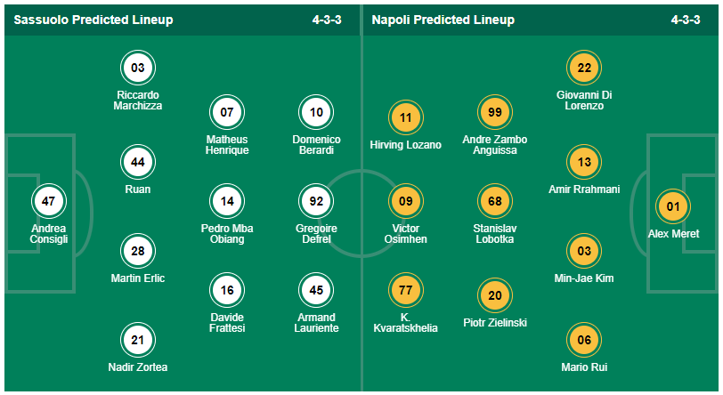 Dù phải làm khách nhưng với đội hình có phong độ cao, nhiều khả năng các cầu thủ Napoli sẽ có chiến thắng trước Sassuolo khi hai đội gặp nhau tại vòng 23 Serie A.