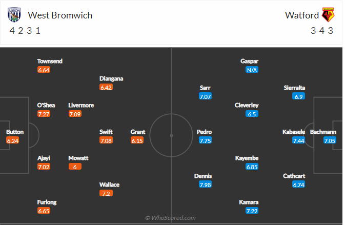 West Brom sau khi rớt hạng từ Premier League chưa thể tìm lại được sức mạnh của mình, mùa giải trước họ chỉ về đích ở vị trí thứ 10 và còn nhiều điều phải cải thiện nếu muốn cạnh tranh chiếc vé thâng hạng mùa này. Đội bóng của HLV Steve Bruce đã khởi đầu mùa giải năm nay không được tốt khi chỉ có được trận hòa trong trận đấu ra quân, họ đặt mục tiêu làm tốt hơn ở vòng 2 tuy nhiên với việc phải đối đầu với Watford thì xem ra điều này không dễ thực hiện. Nhiều khả năng West Brom sẽ tiếp tục mất điểm vòng đấu này.